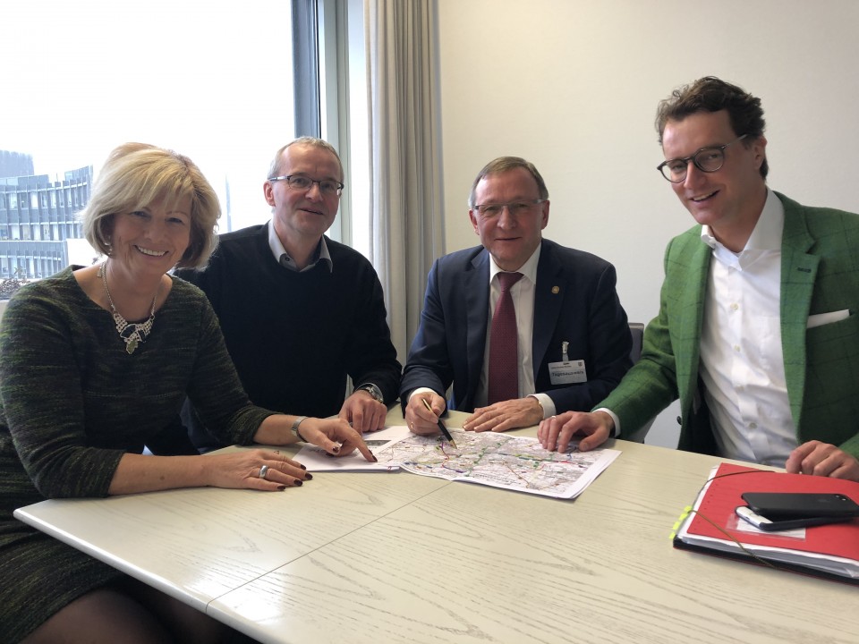 Kirstin Korte, Dirk Büssing, Kurt Nagel und Henrik Wüst„Die in Teilen unkonkreten und durchaus widersprüchlichen Aussagen und Veröffentlichungen des Bürgermeisters, der Stadtverwaltung sowie des Vorhabenträgers Straßen NRW und die Gesprächsprotokolle aus den Düsseldorfer Gesprächen des Bürgermeisters mit der rot-grünen Vorgängerregierung zeigen einfach keine klare Perspektive auf. Dass es im Verlauf des Umgestaltungsprozesses von Mindener- und Kanalstraße durchaus noch zu Veränderungen kommen kann, ist dabei nicht essentiell, aber die Linie und die Meilensteine müssen klar abgesteckt sein und Pflöcke eingeschlagen werden, vor allem im Hinblick auf die städtebauliche Entwicklung entlang dieser Achse“ erläutert Kurt Nagel als Grund für das Ministergespräch. „Wir sind es auch der Bürger- und Unternehmerschaft schuldig, für Klarheit zu sorgen“ ergänzt Dirk Büssing das Motiv der CDU-Fraktionsführung. In dem Gespräch mit Minister Wüst wurde deutlich, dass die Entscheidung zur Umgestaltung beziehungsweise zum Rückbau von Mindener- und Kanalstraße nicht auf der Grundlage der vorliegenden Verkehrsplanungen mit der Berechnung von Verkehrsmengen getroffen wird, sondern auf der Basis von Verkehrszählungen. Die können verlässliche Daten erst nach Abschluss der Bauarbeiten am Löhner Autobahnkreuz und einer gewissen Karenzzeit erbringen, in der sich die Verkehrsströme einpendeln, also keinesfalls vor 2020.