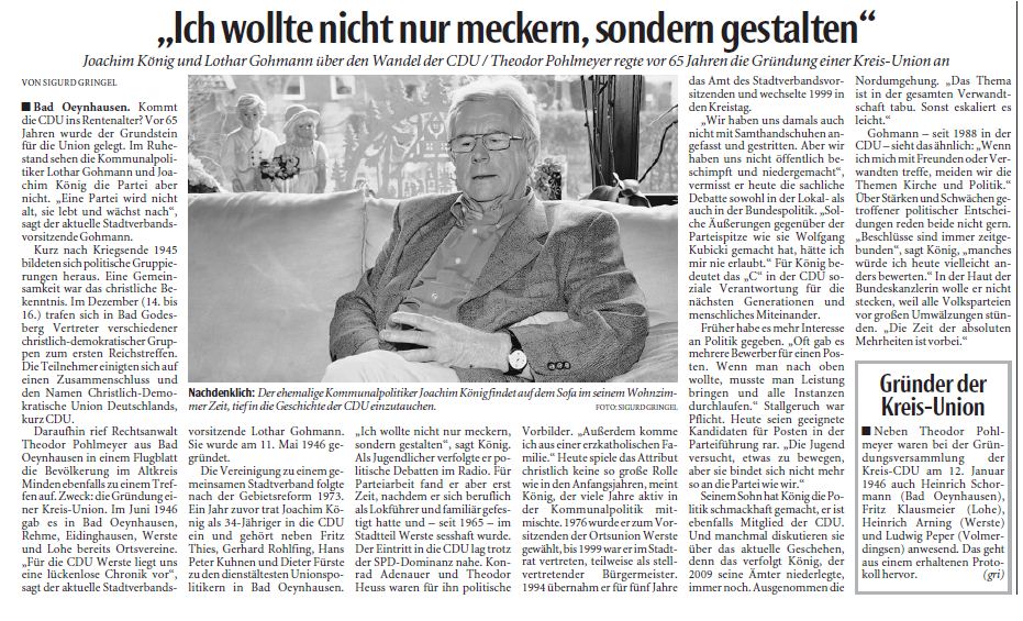 Daraufhin rief Rechtsanwalt Theodor Pohlmeyer aus Bad Oeynhausen in einem Flugblatt die Bevölkerung im Altkreis Minden ebenfalls zu einem Treffen auf. Zweck: die Gründung einer Kreis-Union. Im Juni 1946 gab es in Bad Oeynhausen, Rehme, Eidinghausen, Werste und Lohe bereits Ortsvereine. „Für die CDU Werste liegt uns eine lückenlose Chronik vor“, sagt der aktuelle Stadtverbandsvorsitzende Lothar Gohmann. Sie wurde am 11. Mai 1946 gegründet.